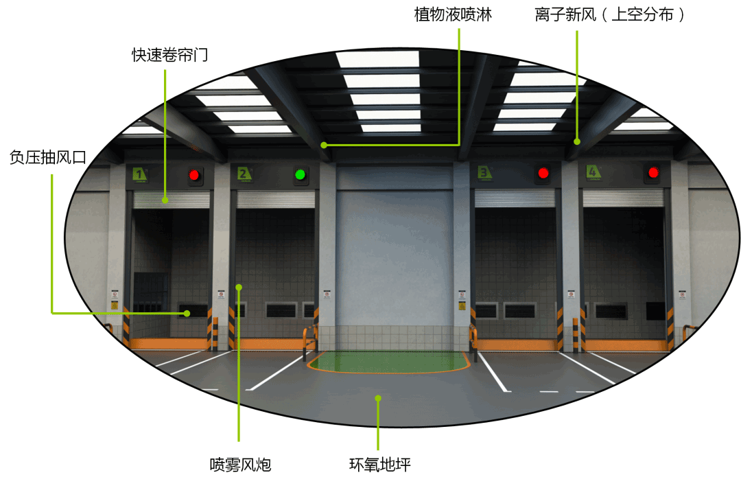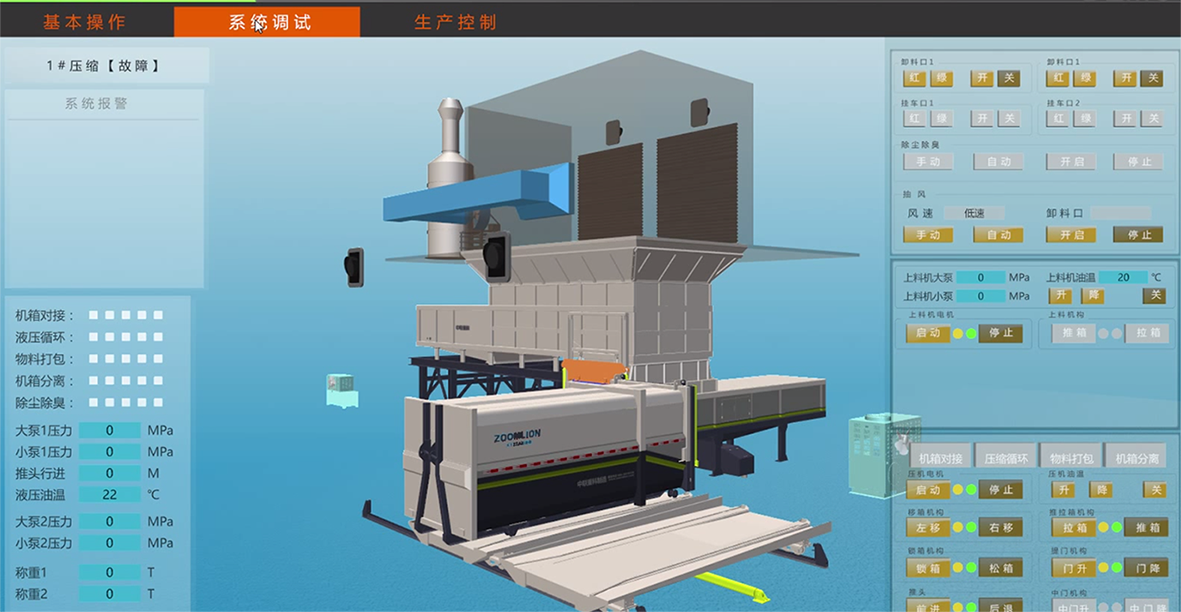 在智能操作方面,大型生活垃圾转运站所有设备均可顺利获得中央控制系统远程操作,站内作业车辆顺利获得交通指挥系统全自动点对点指挥,垃圾压缩循环,快速卷帘门、负压抽风系统、离子新风系统及植物液喷雾除臭系统可按设定程序自动运行,无需人工干预。此外,三维动态仿真中控界面结合站内监视系统,可实现作业过程的适时动态显示及监控。站内配置的自动清渣及自动冲洗系统,使站内清理保洁自动化,解放人工劳动力。